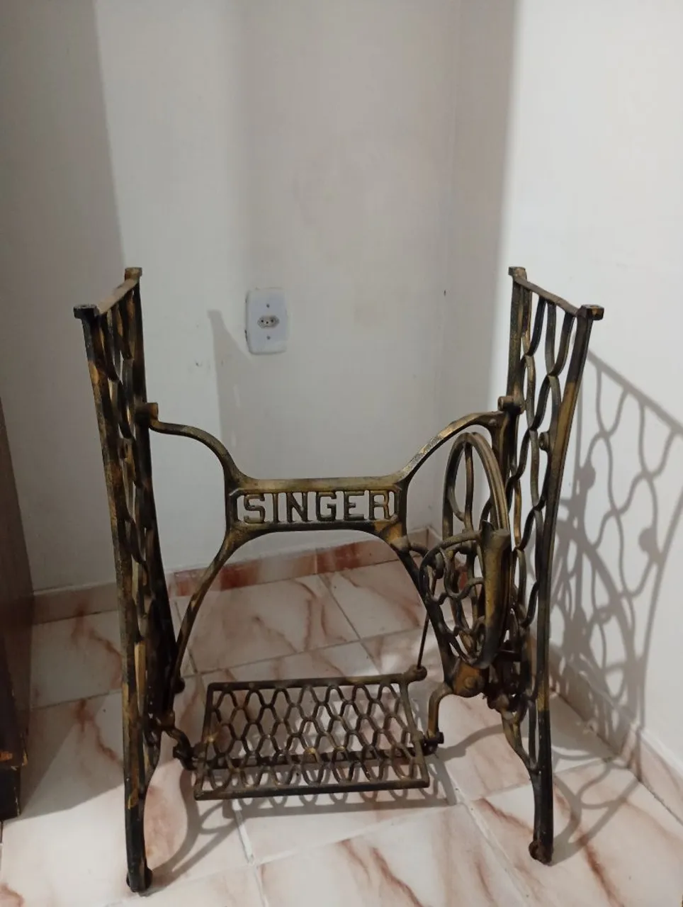 Linda base de máquina de costura Singer antiga, peça de colecionador ou para decoração vintage. Detalhes em metal com design clássico, ideal para dar um toque especial ao seu ambiente.