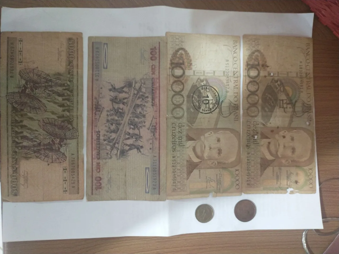 Cédulas antigas de 5000 e 100 cruzeiros, além de notas de 10000 cruzeiros. Ótimo para colecionadores e entusiastas da numismática.