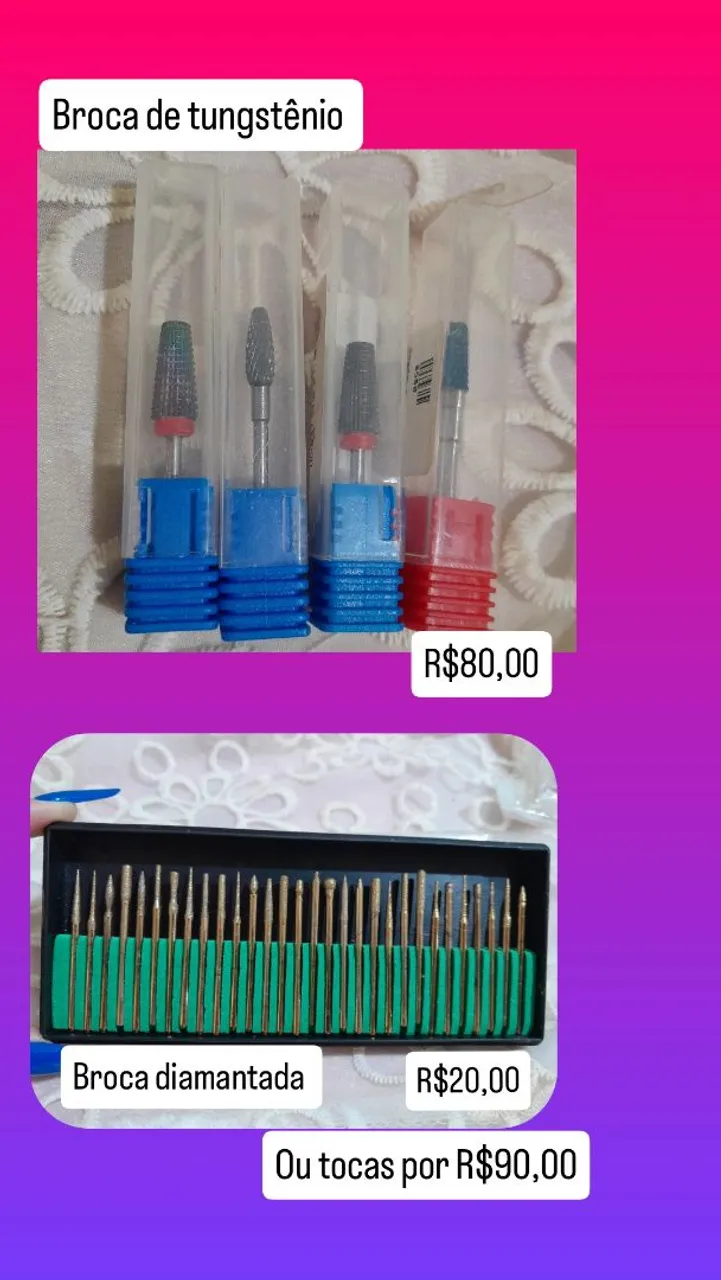 Kit completo para unhas perfeitas! Brocas de tungstênio e diamantadas de alta qualidade para um acabamento impecável. Adquira já o seu! Só entra em contato se tiver interesse.