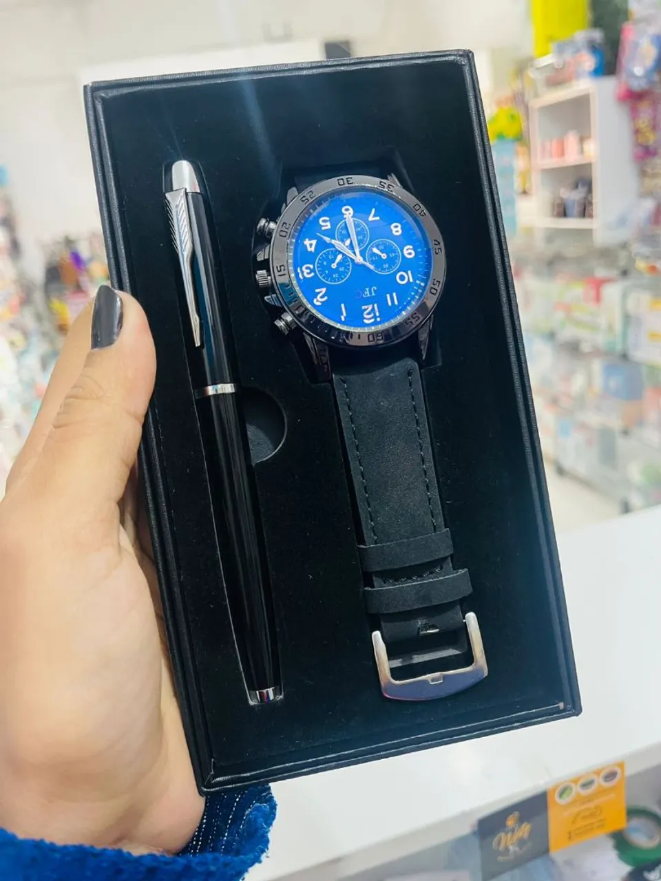 Kit elegante com relógio de design moderno e caneta sofisticada. Perfeito para presentear ou para uso pessoal, combinando estilo e funcionalidade.