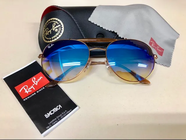 Óculos de sol Rayban original, formato geométrico, armação dourada, lente azul espelhada degradê, tamanho 56.