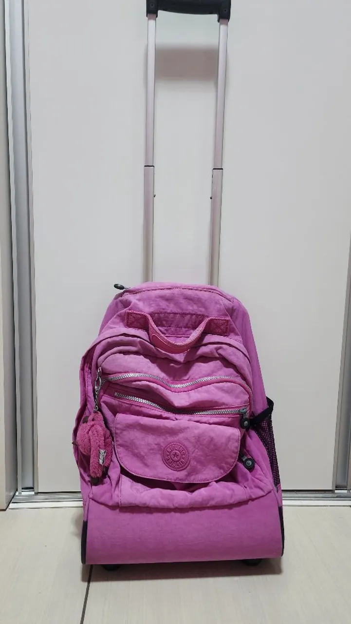 Linda mochila de rodinhas Kipling na cor rosa, perfeita para quem busca praticidade e estilo. Possui vários compartimentos e design icônico da marca, ideal para o dia a dia.