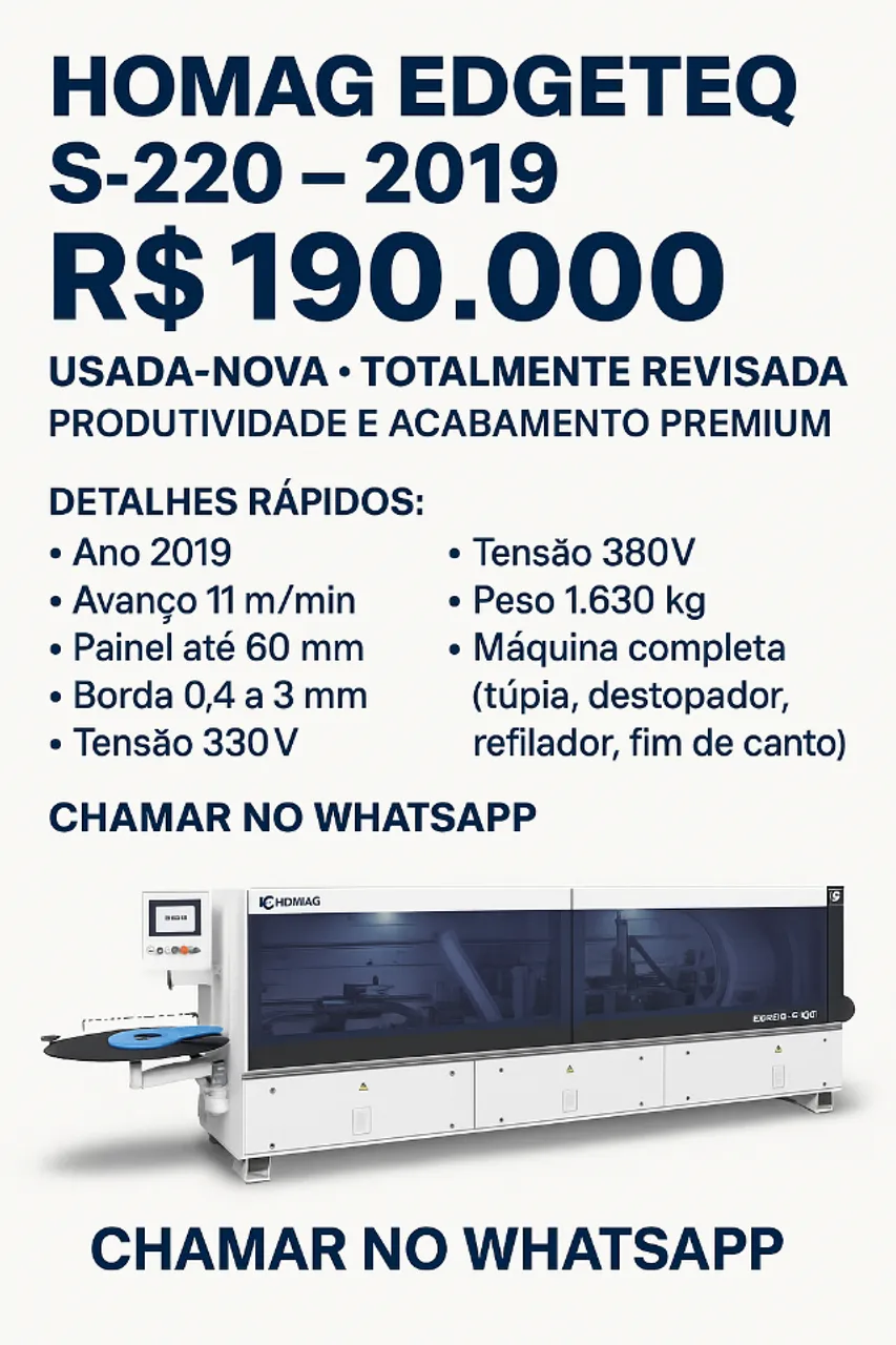 Máquina de borda HOMAG EDGETEQ S-220 de 2019, revisada e pronta para elevar a produtividade do seu negócio. Com avanço de 11 m/min e painel de até 60 mm, oferece acabamento premium e versatilidade. Possui túpia, destopador, refilador e fim de canto.