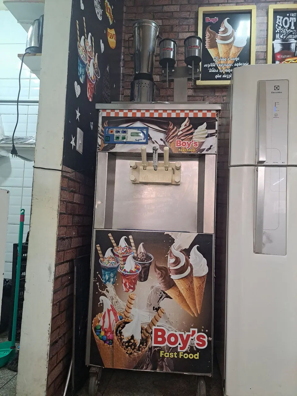 Máquina de sorvete Boy's Fast Food, ideal para o seu comércio. Prepare sorvetes deliciosos e atrativos para seus clientes. A máquina já acompanha liquidificador industrial e batedor de milk-shake duplo. A máquina tem capacidade para 40 litros de sorvete. São dois motores independentes com dois compressores.