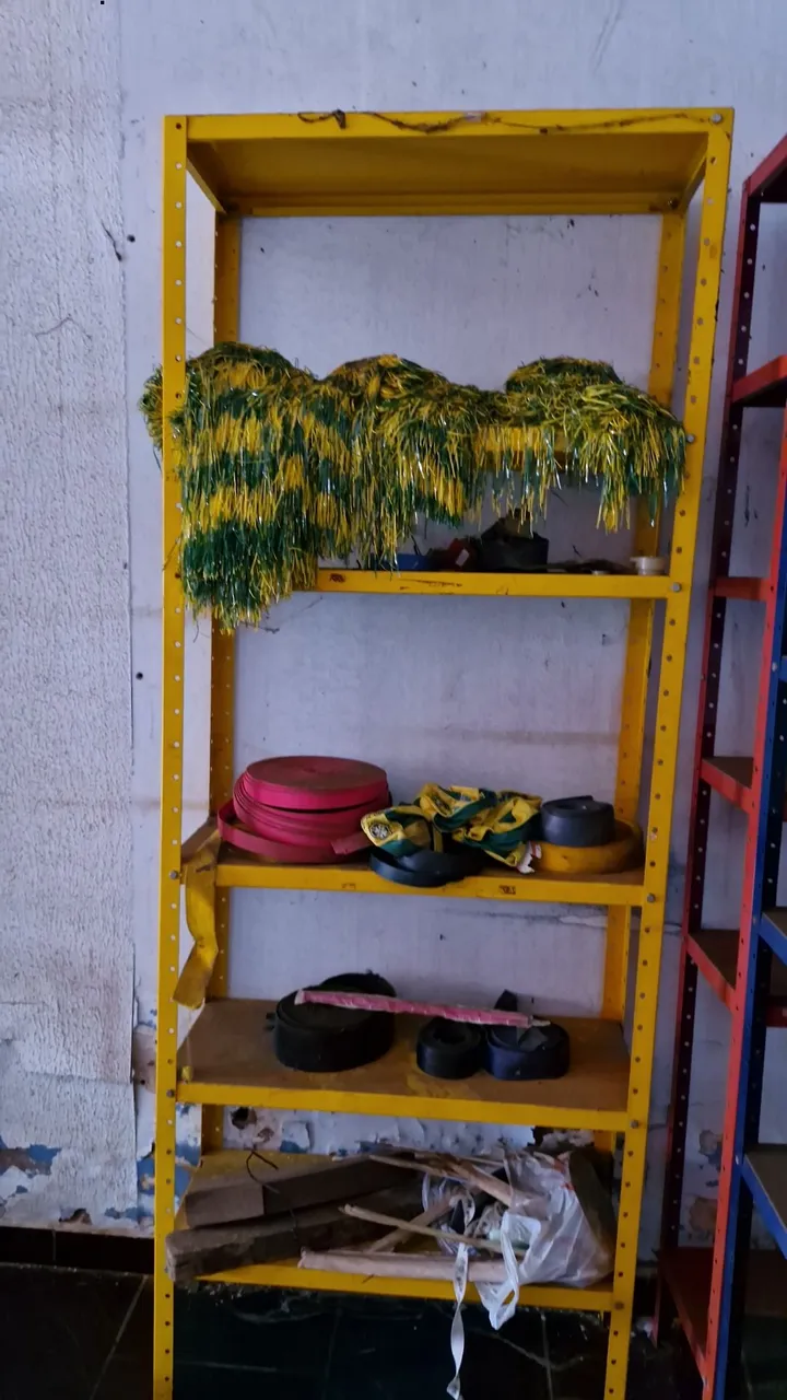 Prateleiras amarelas resistentes, ideais para organização e exposição de produtos em comércios. Ótima opção para otimizar espaço e apresentar seus itens de forma organizada.