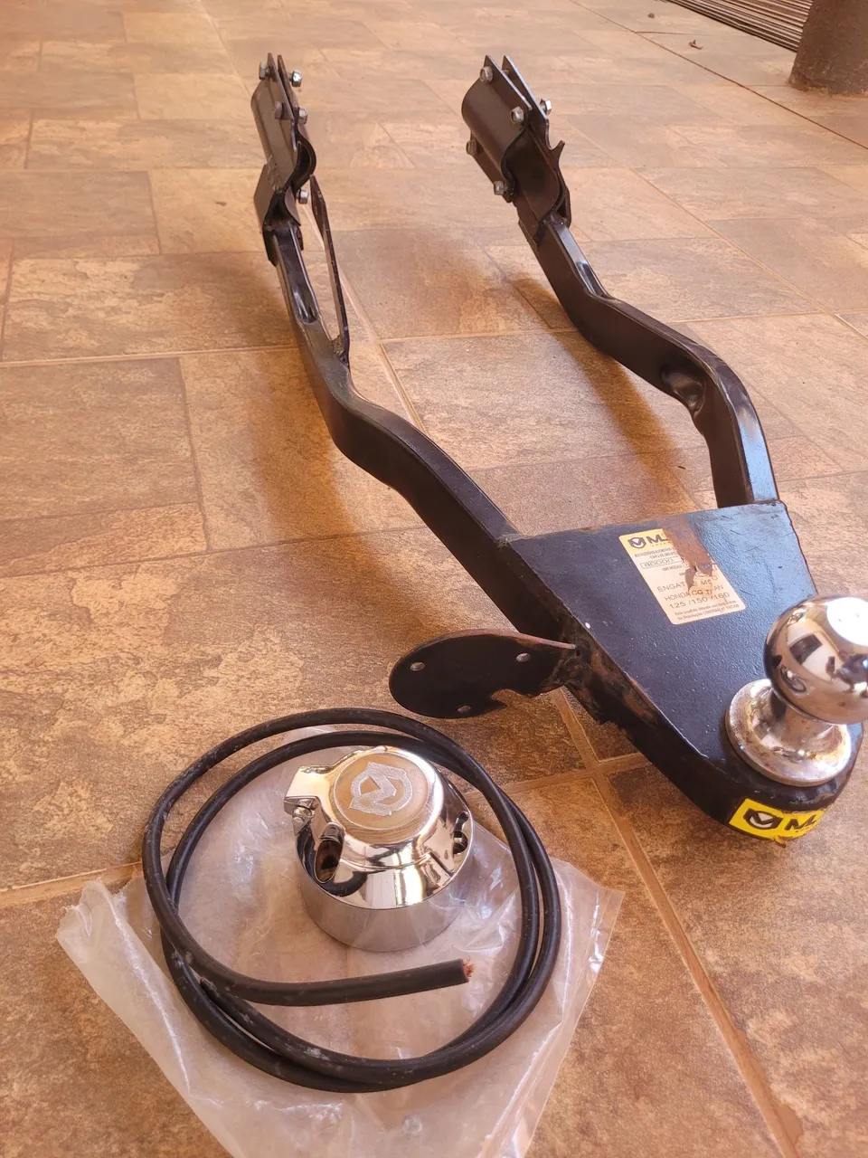 Engate completo para reboque M. G., resistente e pronto para uso. Inclui engate, bola e conector.