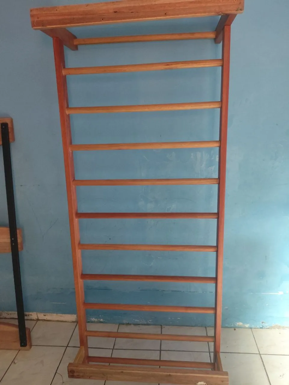 Espaldar de madeira maciça, ideal para exercícios de alongamento e fortalecimento muscular. Perfeito para uso em casa ou em academias, proporcionando um treino completo e versátil.