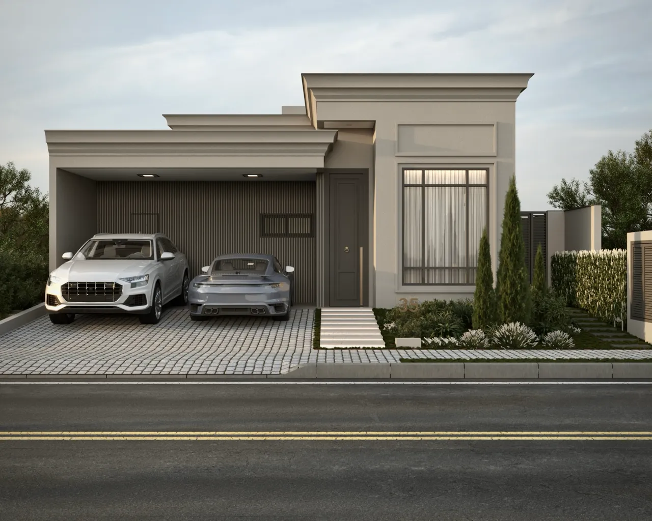 ?- Casa Térrea com 03 suítes com persianas elétricas, Cozinha Gourmet integrada com sala de estar, Piscina com cascata, hidromassagem e trocador de calor, garagem para 2 carros, lavanderia coberta e lavabo.