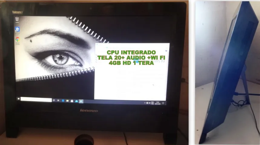 Computador All in One Lenovo com CPU integrada, tela de 20 polegadas, áudio, Wi-Fi, 4GB de RAM e HD de 1TB. Perfeito para suas tarefas diárias com design elegante e moderno.