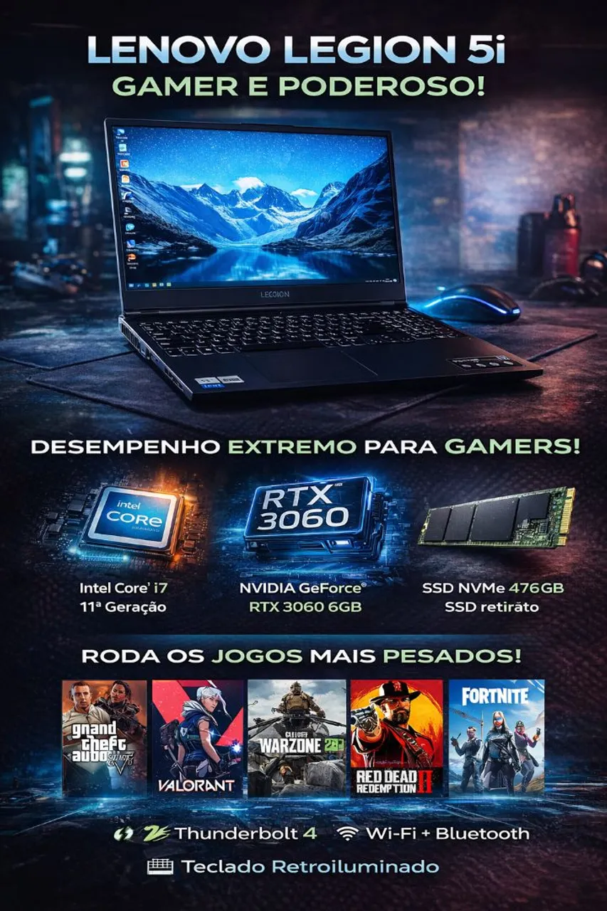 Domine seus jogos com o Lenovo Legion 5i Gamer! Equipado com processador Intel Core i7 de 11ª Geração e placa de vídeo RTX 3060, este notebook oferece desempenho extremo. Desfrute de jogos pesados com fluidez, tela vibrante e teclado retroiluminado. Conectividade Thunderbolt 4 e Wi-Fi + Bluetooth garantem a melhor experiência.