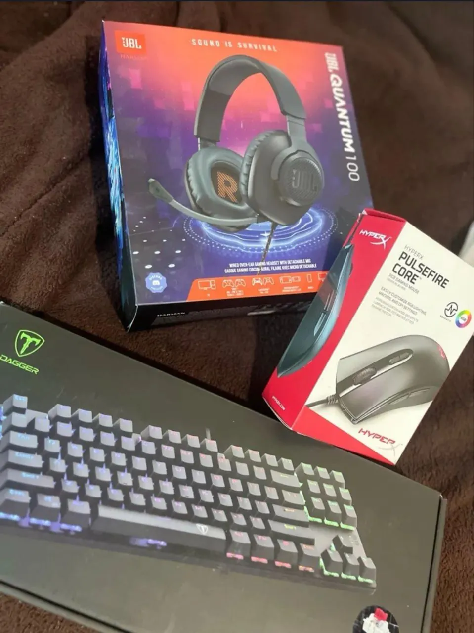 Teclado T-Dagger com iluminação RGB, mouse HyperX Pulsefire Core e headset JBL Quantum 100 para áudio de alta qualidade.