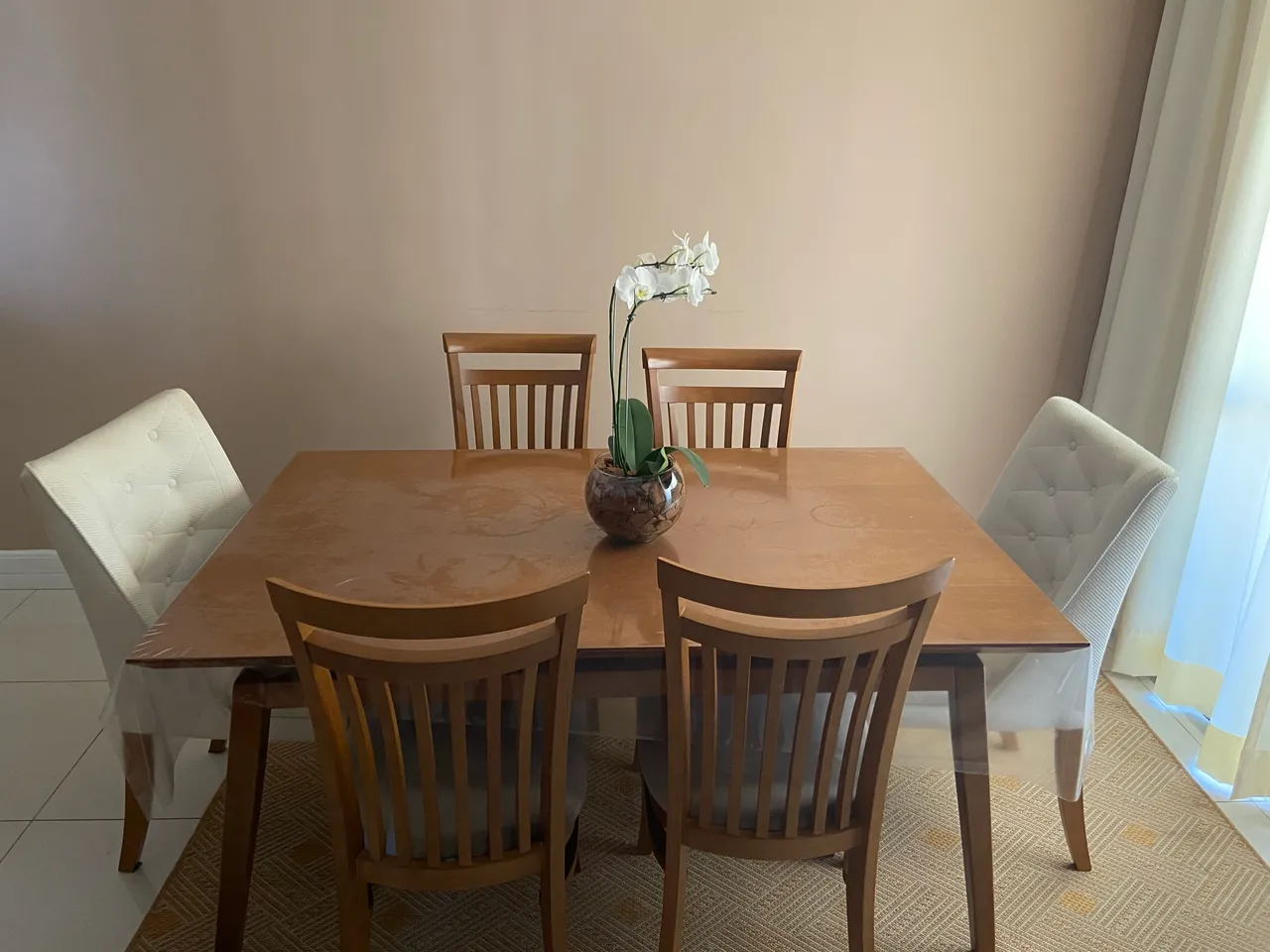 Linda mesa de jantar com design elegante e cadeiras confortáveis, mesa de madeira está em excelente estado, não tem nenhum arranhão, único que está desgastado são as poltronas que estão com manchas já que é cor clara.