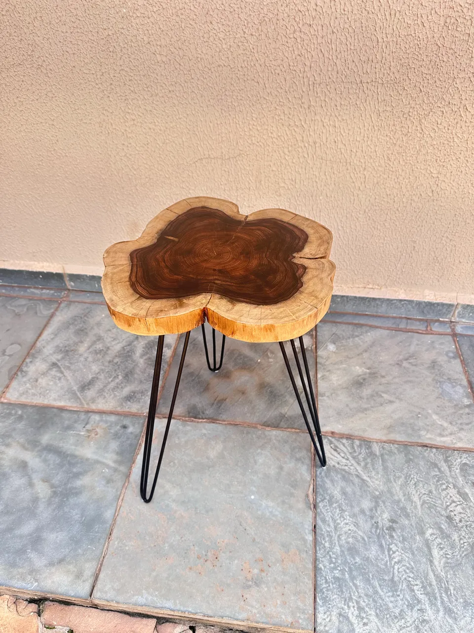 Linda mesa lateral artesanal de madeira, perfeita para complementar sua decoração. Design único e elegante, que traz um toque rústico e sofisticado ao seu ambiente. Peça já a sua!