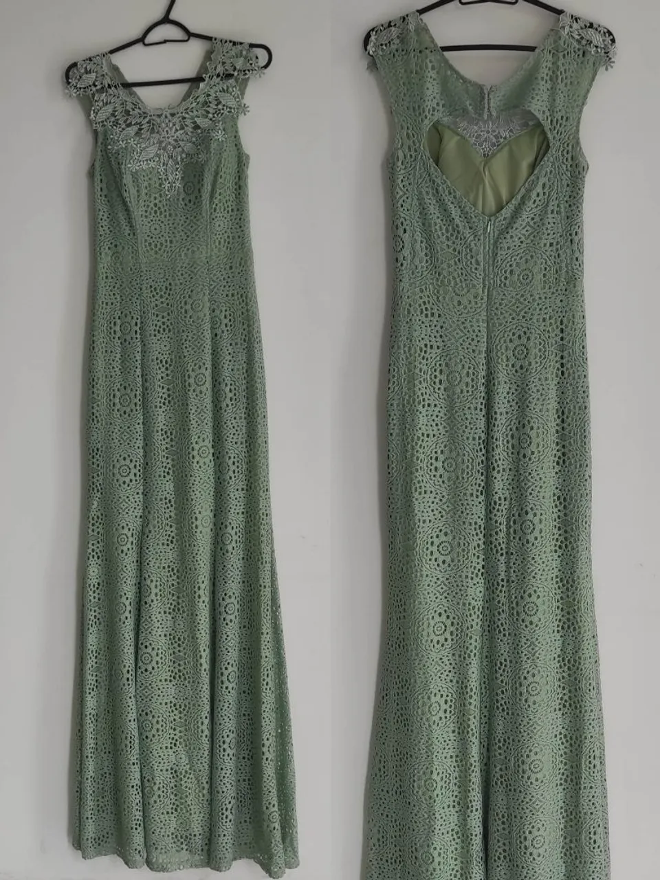 Um vestido longo de renda verde sálvia com detalhes de renda renascença e decote vazado nas costas. NUNCA USADO
